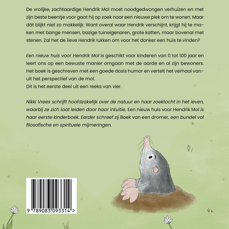 Een nieuw huis voor Hendrik Mol is het eerste deel uit een kinderboekenserie van vijf. Het verhaal leert ons om op een bewuste manier om te gaan met de aarde en al zijn bewoners. Het boek is geschreven met een goede dosis humor en vertelt het verhaal vanuit het perspectief van de mol. De avonturen van Hendrik worden ondersteunt door prachtige handgemaakte illustraties van Emma Groot Wassink. En, zoals al mijn boeken, wordt ook Hendrik CO2 neutraal geproduceerd. Als mijn eerbetoon aan moeder aarde. Een nieuw huis voor Hendrik Mol is geschikt voor kinderen van 0 tot 100 jaar.